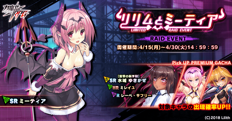 株式会社インフィニブレイン(本社:大阪市中央区、代表取締役:市川 忍)は、オンラインゲームプラットフォーム「DMM GAMES」( http://games.dmm.com/ )にて配信している、近未来くノ一ロールプレイングゲーム『対魔忍RPG』において、期間限定イベント「リリムとミーティア」を2019年4月15日(月)~4月30日(火)に開催いたします。