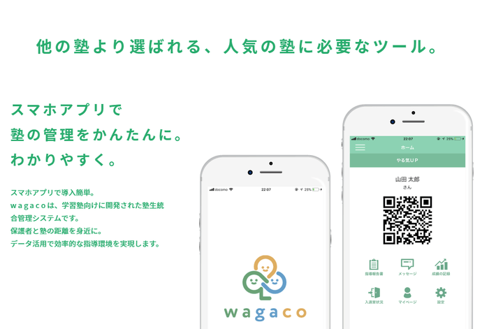 塾経営の課題をICTツールを活用することで、先生たちの定着が向上し、保護者様とシームレスな関係を構築し、未来ある子供たちとの時間を確保する一助としてwagacoを活用していただければと思います。さらにwagacoは高品質なのに無料のICTツールとして提供していきます。