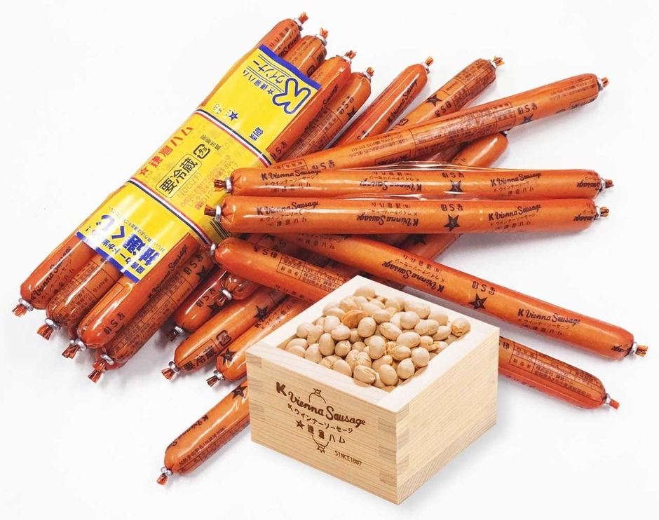 昭和42年、名古屋の中日文化センターで行われた鎌倉ハム主催の料理コンクールで優勝したレシピがKウインナーの恵方巻きです。当時ソーセージを酢飯に巻く、画期的なアイデアに驚いたようですが、現在では長きにわたりスーパーなどでの試食会などで好評を得ております。昭和から平成へ名古屋人のソウルフードとなったKウインナーを平成最後の節分に縁起の良いオリジナル一合升と豆、Kウインナーをセットにした商品を販売することになりました。