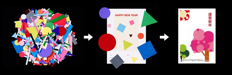 博報堂アイ・スタジオは、2015年より毎年、唐桑中学校において「チャリティー年賀状 デザイン教室」を行なっています。台紙に、デザインの基本要素である丸、三角、四角のパーツを積み木のように組み合わせることで、年賀状のデザインを作りながらレイアウトの基礎を学ぶことができる教室です。当初、このパーツの色は20色ほどの印刷色を使用していましたが、試行錯誤を繰り返しながら独自の色を開発。気仙沼の椿の葉や土などの地域の自然素材や、現地の風景写真などから抽出した色を使うことで、デザインの幅を広げるだけでなく、地域に根ざした体験教室を目指してまいりました。