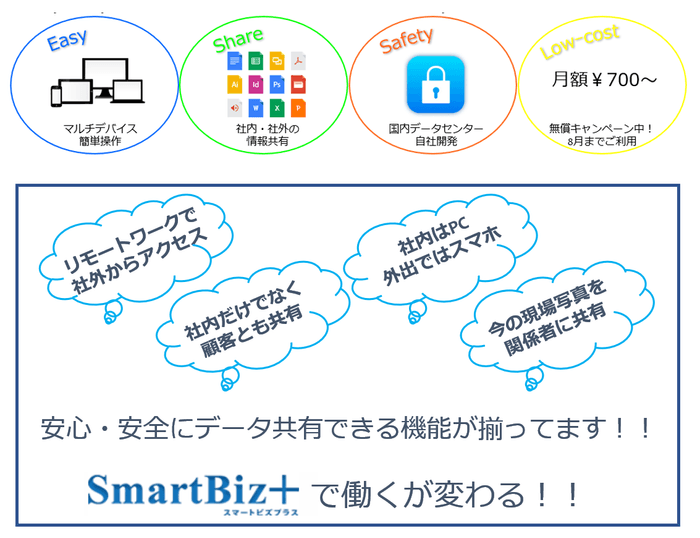 「SmartBiz+」は、どこにいても、他の社員・お客様・取引先等とファイルを安全かつかんたん操作で共有することができる機能を備えた、法人向けクラウド型ファイル共有サービスです。2010年の販売開始以来、建設業、通信業、税理士法人等、さまざまな業種のお客様にご利用いただいています。