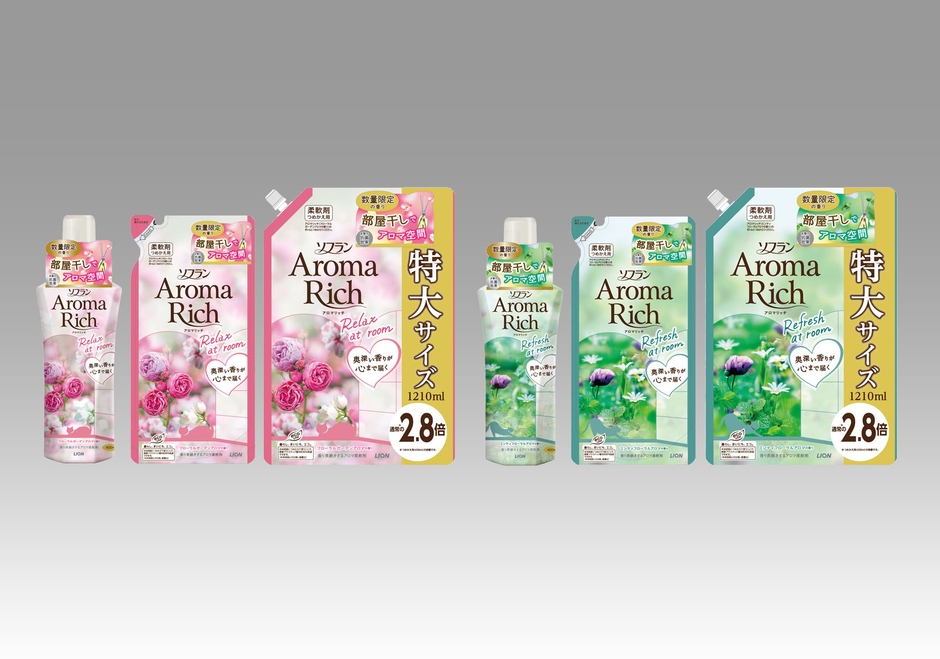 そこで『ソフラン アロマリッチ』は、気分が下がってしまうような「部屋干し」を少しでも気軽で楽しく感じていただけるように、部屋干し中の空間にアロマが広がり、リラックスタイム・リフレッシュタイムを演出する『フローラルガーデンアロマの香り』と、『ミンティフローラルアロマの香り』を数量限定で発売いたしました。