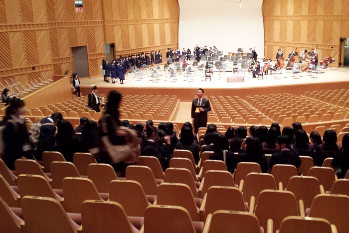 「広島交響楽団リハーサル・バックステージツアー」は、中国地方唯一のプロオーケストラである広島交響楽団の福山定期公演にあわせ、本番直前のゲネラル・プローベ(最終リハーサル)でコンサートに向けたプロオーケストラの音作りを生徒たちが間近で見学する取り組みです。豊かな感性を育み、これからの学校生活・音楽活動の励みとし、演奏家や音楽家を将来の選択肢のひとつに考えるきっかけにつながることを期待しています。