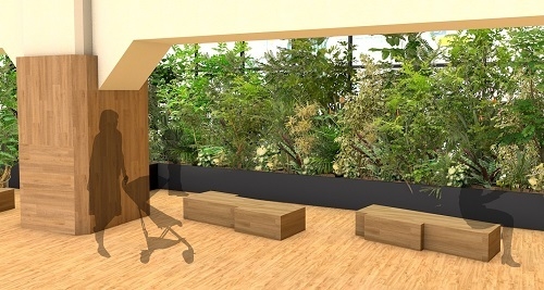 天井のスケルトン化や壁面のガラス化に加え、グリーンやベンチを設置し、シンプルで心地よいデザインにしています。インフォステーション壁面装飾には電車のレールスライスを採用するなど“京阪らしさ”も随所に散りばめています。