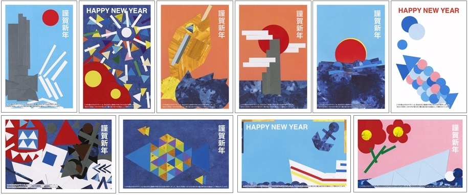 作品は、同校の2年生が、○△□の単純な図形の組み合わせで年賀はがきのデザインを制作したものです。「気仙沼について、全国の人に知って欲しいこと」をテーマに、生徒たちが伝えたいと思う「気仙沼の魅力」が表現されており、海の幸や自然など気仙沼ならではの魅力がつまっています。
