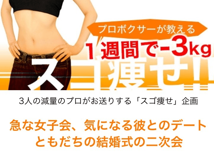 1週間で3キロ減量を目指して、現役のプロボクサーがスペシャル減量プランを作成。自宅でできるペットボトルトレーニングやアボカドを使ったスムージーなど、簡単だけど本格的な減量にチャレンジできるサービスです。毎日体重を入力して、成果をグラフで確認することができ、プロボクサーからの動画応援メッセージも受け取ることができます。女子会やデートなど決戦日に向けてスマホで減量キャンプをお楽しみいただけます。