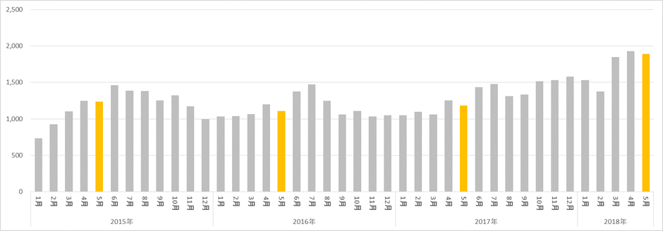 購買ビッグデータ分析の株式会社True Data(トゥルーデータ/本社:東京都港区、代表取締役社長:米倉 裕之)は、全国ドラッグストアのPOSデータによる2018年5月のインバウンド消費動向調査を発表します。当月のインバウンド消費購買件数は1店舗あたり1,889件で、前年同月(1,183件)比は59.7%増と大きく伸長し、当社の調査開始以降5月として過去最高件数を記録しました。1レシート当たりの購買単価は前年同月比7.4%増の15,413円で、好調に推移しています。売上個数ランキングで虫よけシールの「虫きちゃダメ 60枚」が第2位にランクインしました。この商品がトップ3に入るのは調査開始以降初めてです。インバウンド消費における、子ども向け商品への関心の高さがうかがえます。