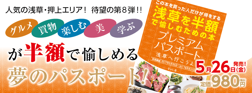 シリーズ第8号となる「浅草へ行こうよ Vol.8」は、人力車遊覧体験やとんぼ玉製作体験など浅草ならではのプレミアム体験の初掲載を実現しました!さらにスペシャルページでは最上級神戸牛の盛合せやこれからの季節にぴったりの本染め手ぬぐいなど、様々なジャンルが充実しており、夏の思い出作りにも一役買えます。本書片手にランチ・体験・食べ歩き・ディナーなど一日まるごと半額でお楽しみいただけるこのお得感はまさにプレミアムです。