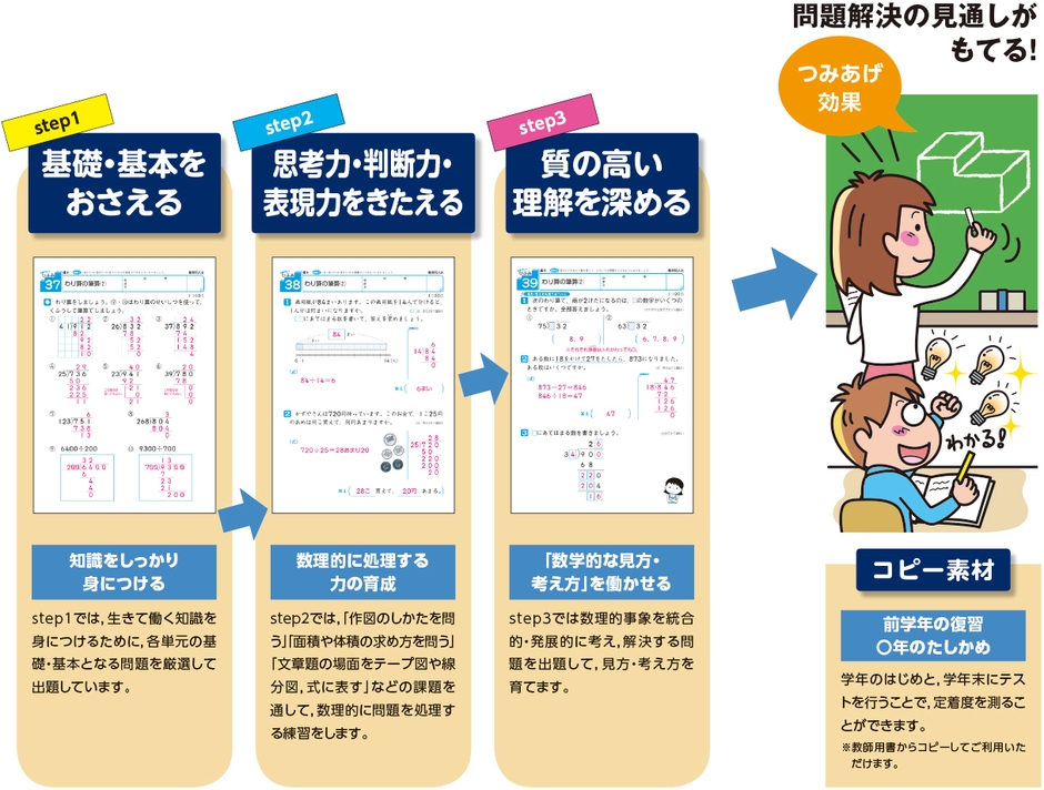 「基礎・基本をおさえる」「思考力・判断力・表現力をきたえる」「質の高い理解を深める」の3ステップで、生きて働く知識の習得に取り組むことができます。