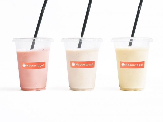 Hacco to go! の酒粕ドリンクは、アルコールを飛ばした酒粕をさらに乳酸菌発酵させ、ヨーグルトのような味わいを持つHacco酒粕を使用し、ドリンクの幅が広がります。