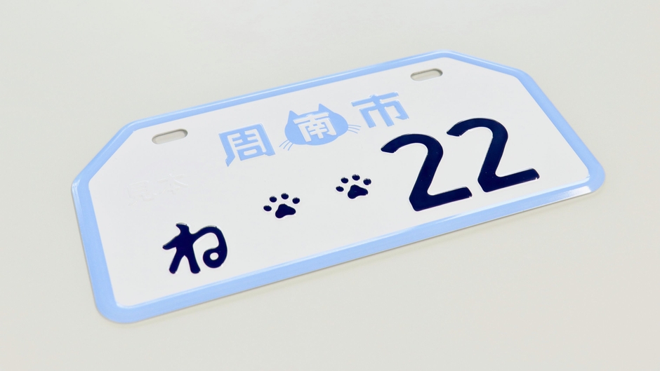 ナンバープレートは、縦10センチ、横20センチ。しゅうニャン市のイメージカラーの水色で縁取られ、地名の周南市には「しゅうニャン市」のロゴを採用。ひらがな表記は「ね」で統一し、4桁の車両番号が3桁以下の場合に表示される「・」を、ネコの肉球で表記しました。今年度400枚限定で発行。