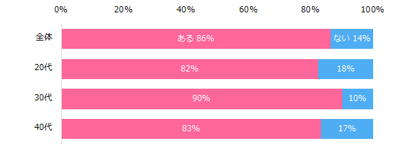 「職場の人間関係で悩んだことはありますか?」と伺うと、86%が「ある」と回答しました。年代別に見ると、特に30代(90%)の回答が目立ちました。
