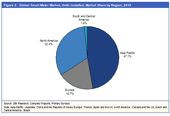 2010年にスマートメーターの設置において、アジア太平洋(APAC)地域は、世界市場の47.1%を占め、首位となりました。そして、次に北米が32.4%のシェア、欧州が18.7%とつづいています。