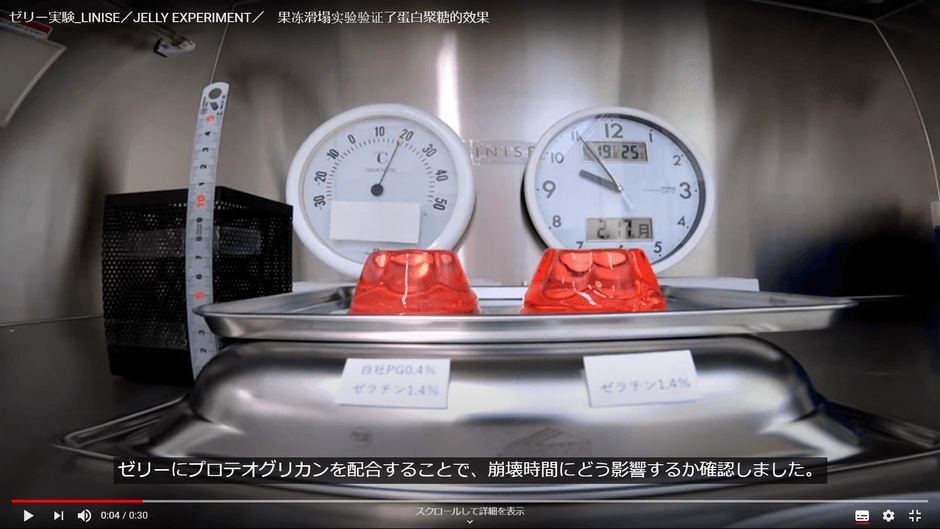 本年より、プロテオグリカンの機能性を可視化する各種実験に取り組んでおります。その第1段としまして「ゼリーを使ったプロテオグリカンの形状維持力(保水性能)の比較実験」を行ない、当社HPへ動画をアップいたしました。