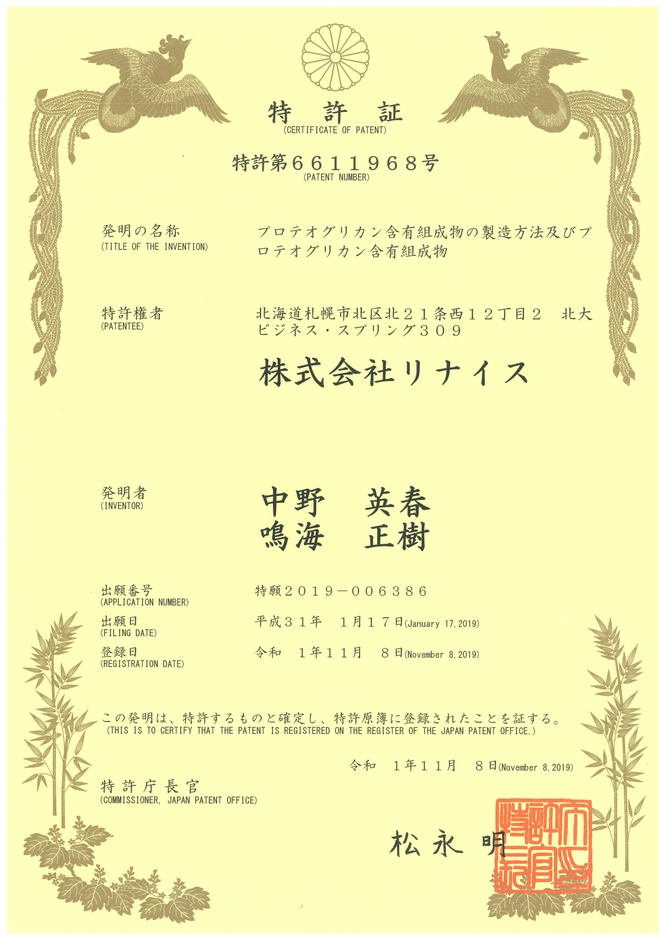 機能性原料プロテオグリカンなどの製造メーカー株式会社リナイス(本社:北海道札幌市、代表取締役:中野 英春、鳴海 正樹)は、2019年11月8日、プロテオグリカンに関する新たな製造法及びその組成に関する特許が登録されましたのでご報告いたします。