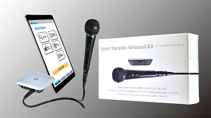 これまでのスマカラはiPhone 4SやiPad 2などの30ピンのDockコネクターを装備したiOS端末用でしたが、今回発売したアドバンストキットはLightningコネクターを装備したiOS端末用に必要な機器と1ヶ月無料で全曲歌える利用券をセット化したものです。