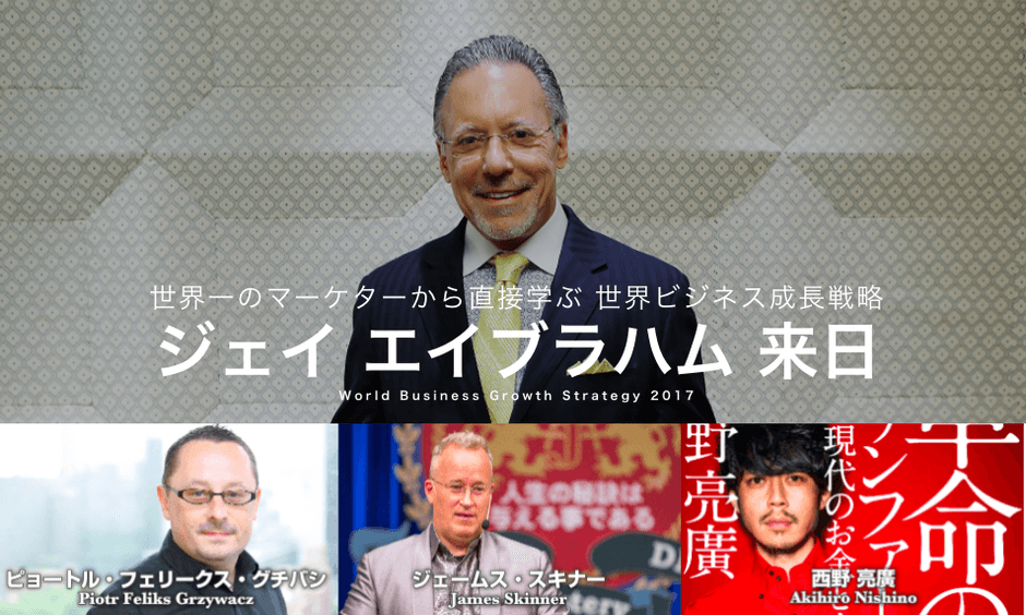 世界のマーケティング最新戦線を学ぶ Google、Microsoft、モルガン・スタンレー、FedEx 名だたる企業が直接学んだ世界トップのビジネス成長戦略 No.1コンサルタント ジェイ・エイブラハム氏が来日し、 成功するマーケティングセミナーを開催する。 「革命のファンファーレ」キングコング西野氏が、 マーケティングについて語る。