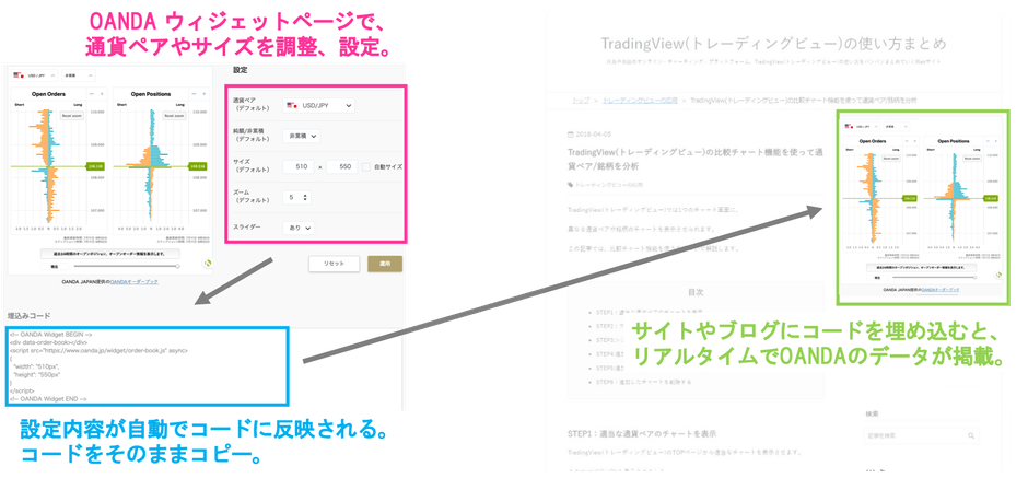 たった数行のコードを、サイトへコピーペーストするだけで、OANDAのデータをあなたのコンテンツとして掲載できます。