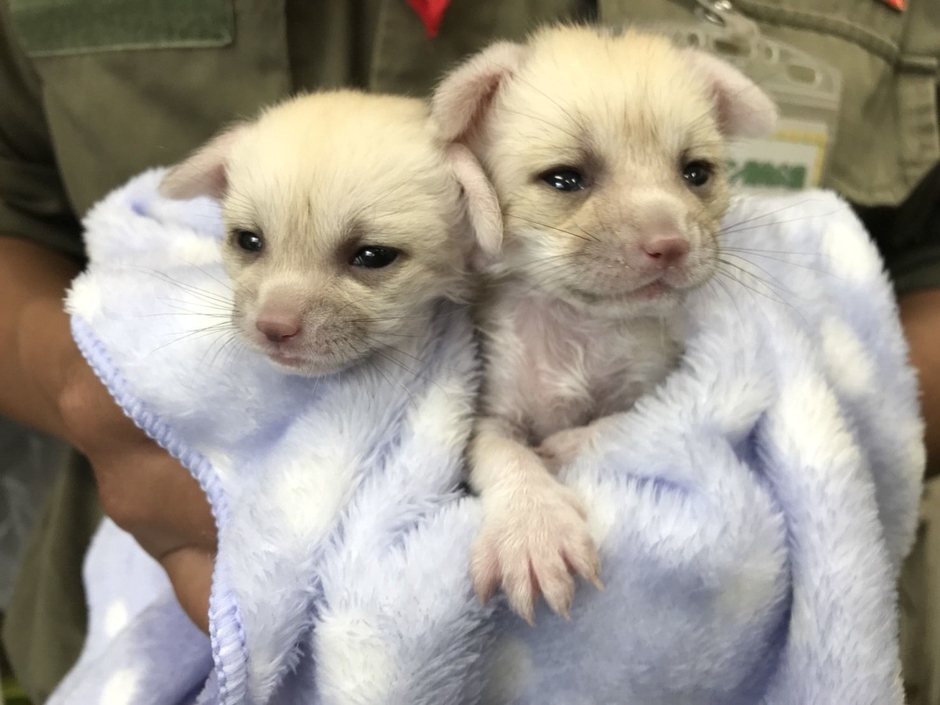人工哺育中のフェネックの双子の赤ちゃん『ベガ(メス)』と『アル(オス)』は、2018年7月7日に誕生しました。しかし母親『ナミ』(4歳)が過去に上手く育児ができなかった為、飼育員が当日保護しました。以降、飼育担当者が親代わりとなり保育器に入れて人工哺育を開始、保護当初は体重45グラムほどで1日7回約3時間おきに授乳をしていましたが、現在は約225グラムまで成長しています。