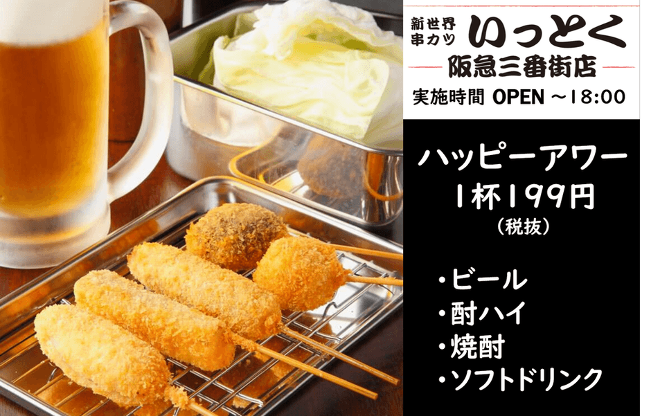 新型コロナウイルスによる緊急事態宣言が解除されたことを受けまして、「手軽に串カツを楽しめる居酒屋」をコンセプトに営業しております新世界串カツ いっとく阪急三番街店(運営:株式会社徳原興産)は、ランチ定食ご飯おかわり無料サービスと1杯199円(税抜)となるハッピーアワーを実施いたします。
