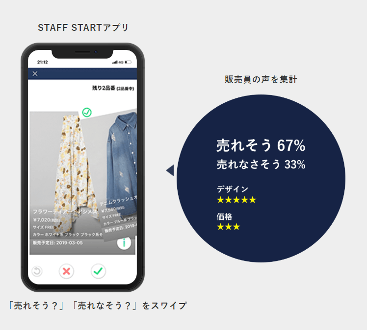 ・バイヤー、MDが販売員に対して、「STAFF START(バイヤー機能)」を利用し、アプリからサンプル商品情報を投稿します。その情報に対し、販売員が事前に売れ筋予想を行い、全てのデータは集計され本部に共有されます。