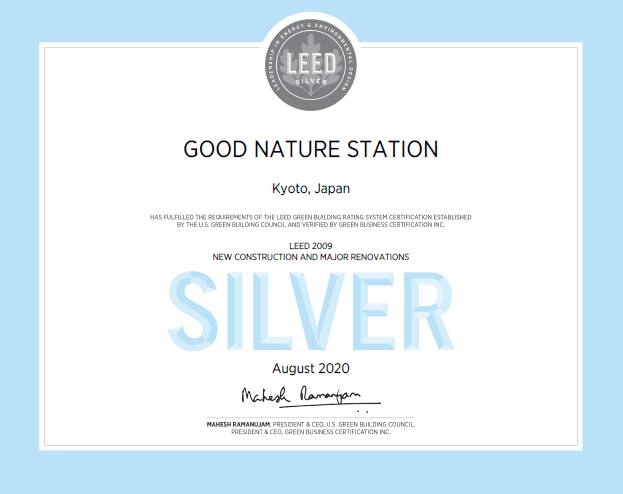 株式会社ビオスタイル(本社:京都市下京区、社長:三浦達也)が運営する「GOOD NATURE STATION」(2019年12月オープン)は、2020年8月15日に環境に配慮したグリーンビルディングを評価するプログラム「Leadership in Energy & Environmental Design(以下LEED認証)」をシルバーランクで取得いたしました。(※1)