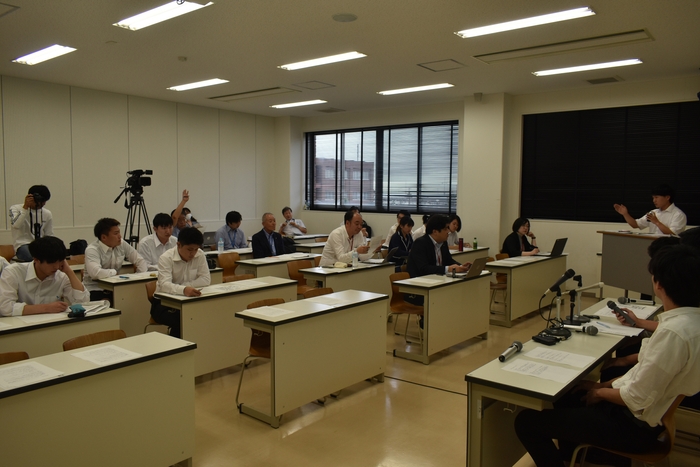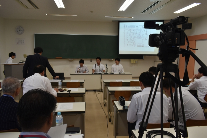 実社会で求められる危機管理の素養を身に付けるため、千葉科学大学(千葉県銚子市潮見町)危機管理学部は2019年9月4日、大学マリーナキャンパスで、全国でも珍しいメディア・リテラシー・トレーニングの集中講義として、学生による模擬記者会見を開きました。