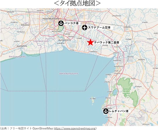 同地区はバンコク港、レムチャバン港、スワナプーム空港等の重要物流施設の中間地点にあり、お客様の幅広いニーズにお応えできるロケーションです。このたび、テパラック倉庫(2023年1月開設、約20,000平方メートル)に次ぐ拠点として「テパラック第二倉庫」を開設し、タイの製造業回復に伴う旺盛な倉庫需要にお応えするとともに、ロジスティクス事業の更なる拡大を目指します。