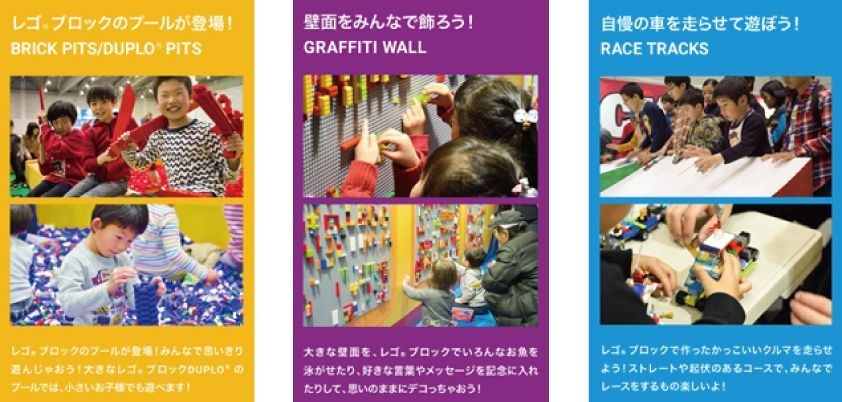 LEGO(R)ブロックを入れた最大タテ約5m×ヨコ約4mのまるでLEGO(R)ブロックのプールのような「ブリックピット」で遊んだり、自分で作ったクルマを走らせてレースができたり、自由に作ったタワーや家などの建築物を配置して巨大な地図を完成させることもできます。