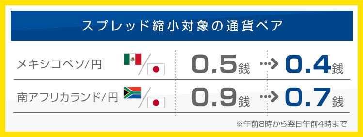 ※クリスマス、年末年始期間は、市場流動性の低下が予想されるため、スプレッド縮小キャンペーンの対象外とさせていただく予定です。予めご了承ください。詳しい日程が決まりましたら、改めてご案内いたします。