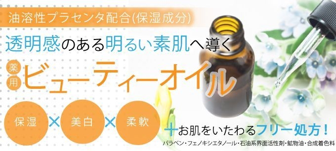 従来の美容オイルが持つ「保湿効果」「エモリエント効果」「エイジング対策」に「美白効果」がプラスされた高機能薬用オイルです。8種の天然保湿美容オイル(シュガースクワラン(サトウキビ)・植物性スクワラン(オリーブ)・ヒマワリ油・メドウフォーム油・オリーブ油・ホホバ油・ローズヒップ油・マカデミアナッツ油)と油溶性プランセンタを配合。