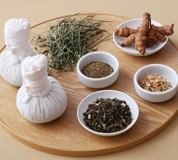 さんぴん茶は、緑茶にジャスミンの香りを移した、沖縄でよく飲まれているお茶です。ビタミンCを含み、利尿作用やホルモンバランスを整えてくれます。さんぴん茶と月桃、パパイヤ、クヮンソウ、ウコンを調合した琉球ハーブボールを温め、じんわりと身体をほぐしていきます。心地よく広がる香りとともに深いリラクゼーションをご体感ください。