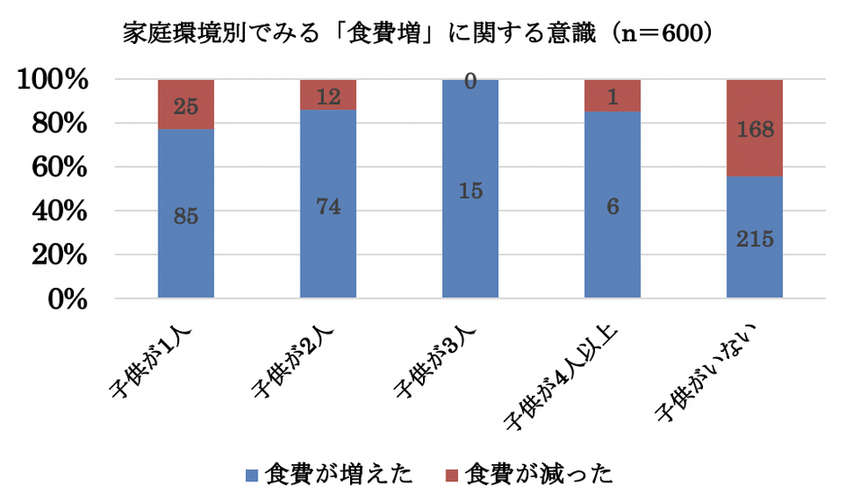 新型コロナウイルスの影響によるテレワーク、また臨時休校による生活の変化、コスト負担について一都三県に住む600名の働く女性にアンケートを行いました。「出費の増減はどうか?」という質問に対して、「出費が増えた」と答えた方が73%(438人)、「出費が減った」と答えた方が27%(162人)という結果となりました。7割以上の女性が出費増を感じている中で「増えた出費の種類を教えてください」と質問したところ(複数回答可)、54.8%(394人)と実に半数以上の方が「食費」と答えて、続いて12.5%(90人)で「外食費」、9.9%(71人)で「娯楽費(書籍購入など)」、7.9%(51人)で「教育費(子供向けドリルなど)」という回答になりました。在宅勤務、またリモートワークにより自宅で食事する機会や自宅近所のカフェなどで仕事をする女性が増えた結果といえます。食費が増加したと答えた394人の家庭環境別(子供の有無)でみると「子供が1人」のご家庭で8割近く、「子供が3人」のご家庭では全員が「負担が増えた」と回答していました。「子供がいない」女性であっても半数以上の方が「食費が増えた」と回答しています。当然ですが子供が多いほど食費の負担が大きいため、臨時休校による負担がいかに大きいかが伺えます。