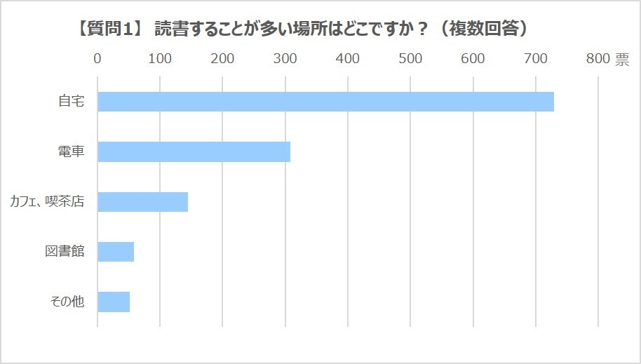 読書をする場所は「自宅」、次いで「電車」「カフェ、喫茶店」が続きます。
