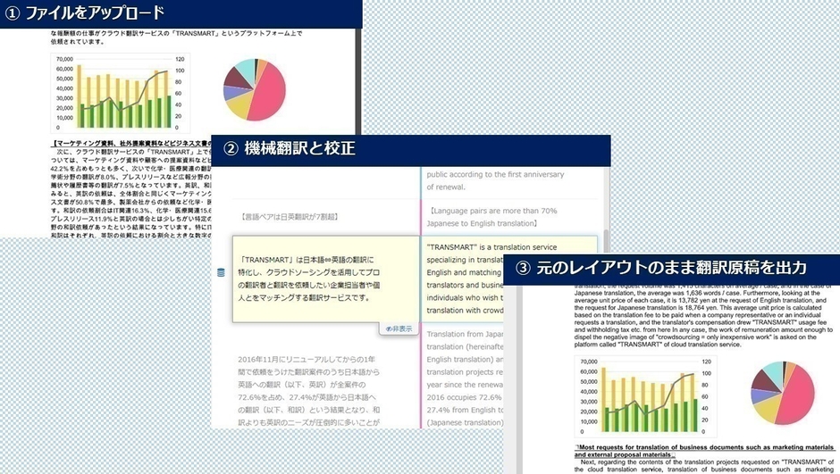 翻訳したい文章(日本語または英語)をファイルアップロードすることで、その場で機械翻訳結果を反映します。翻訳前の文章と翻訳結果が1文ごとに対で表示されるシンプルなインターフェイスで、その場で翻訳結果の編集も可能です。編集して保存するたびに、翻訳内容が保存・記憶されユーザーに最適化された用語、表現に進化していきます。