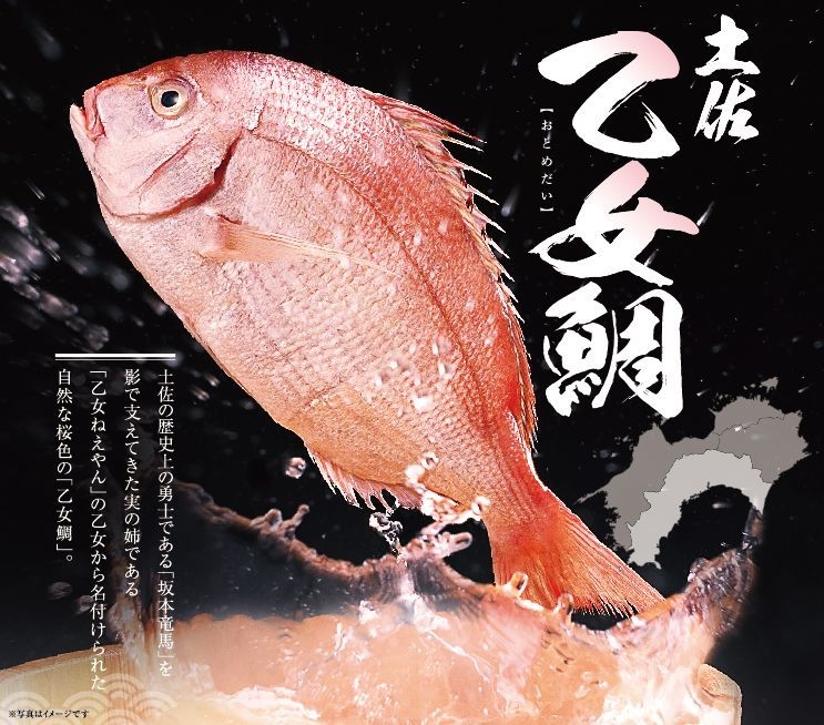 平成30年の新メニューの目玉は「土佐の乙女鯛(おとめだい)」を使ったお料理です。潮の流れが速い“黒潮”で育った「乙女鯛」は、活〆・血抜き・神経〆など生産者の一貫した管理体制により、鮮度を保ったまま店舗に届きます。千年の宴では、乙女鯛をお刺身または焼物で提供いたします。なお、「乙女鯛」の名称は、土佐の幕末の志士である「坂本龍馬」を影で支えた実の姉「乙女ねえやん」に由来します。