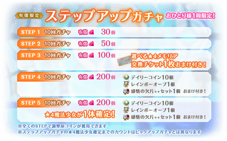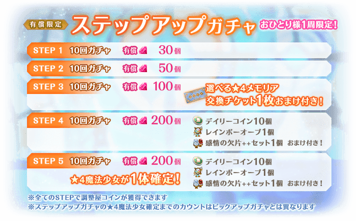 各STEPに応じて、消費する有償マギアストーンの個数や、獲得できるおまけが異なりSTEP3では「選べる★4メモリア交換チケット」を1枚獲得でき、さらに、STEP5では★4魔法少女が確定で登場いたします。