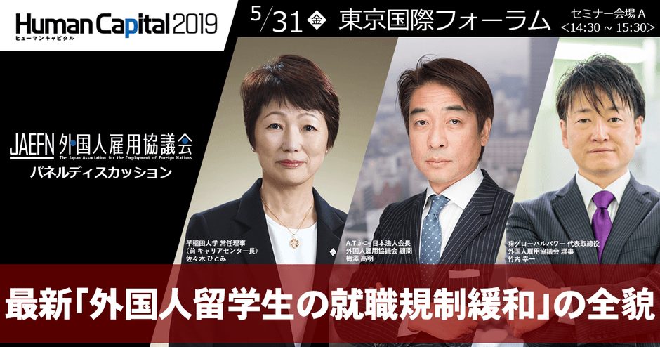 一般社団法人外国人雇用協議会は、「特定活動」の規制緩和が日本企業にもたらすインパクトや産学連携のあり方についての新潮流を紹介する場として、日経グループが主催する展示会『ヒューマンキャピタル 2019』(東京国際フォーラム)で、2019年5月31日(金)にパネルディスカッションを開催いたします。