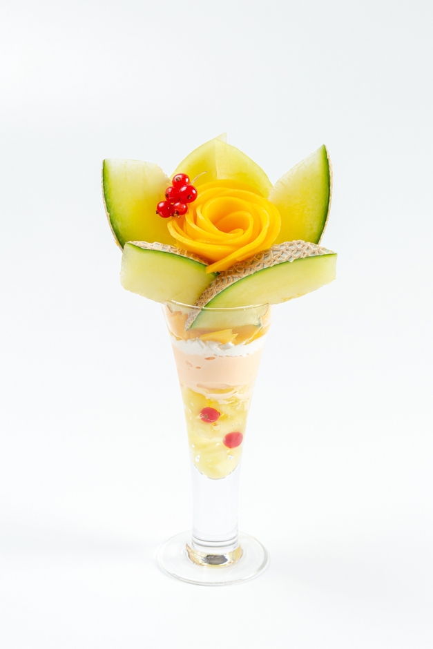 たっぷりと飾られたマスクメロンとマンゴーの下にはマンゴーアイスやメロンアイス、さらにグラスの奥には食感が楽しいぷるるんゼリーと共にマスクメロン果肉が隠れており、最後までフルーツを味わうことができる、果物専門店ならではのパフェです。色鮮やかな赤いレッドカラントを散りばめ、メロンとマンゴーを美しく大胆に盛り付けることで、色合いや見た目でもフルーツを楽しめる一品に仕上げています。