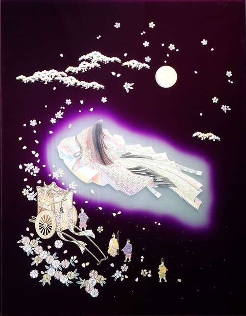 「絹糸・金糸・銀糸を1本1本紡ぐ」「糸で1本1本生地を織る」「生地を1色1色染める」「針と糸で1刺し1刺し刺繍を施す」このような工程を何十日・何百日も経て創り上げる「着物」や「帯」を作品の素材として使用します。1つの作品を完成させるためには何十人もの伝統技術を持った職人が必要です。また、何十年・何百年も昔の「着物」や「帯」も作品として蘇らせる事もできます。