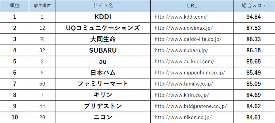 一方で、全面的なリニューアルによって設計・デザインを大幅に刷新した結果、上位にランクインしたサイトもあり、10位のニコン(昨年20位)や、7位のファミリーマート(昨年60位)、3位の大同生命(昨年順位なし)などはサイト全体の一貫性やサイトゴールに至る主要プロセスの設計、情報検索性の高さなどにおいて優れた点が多く見られました。