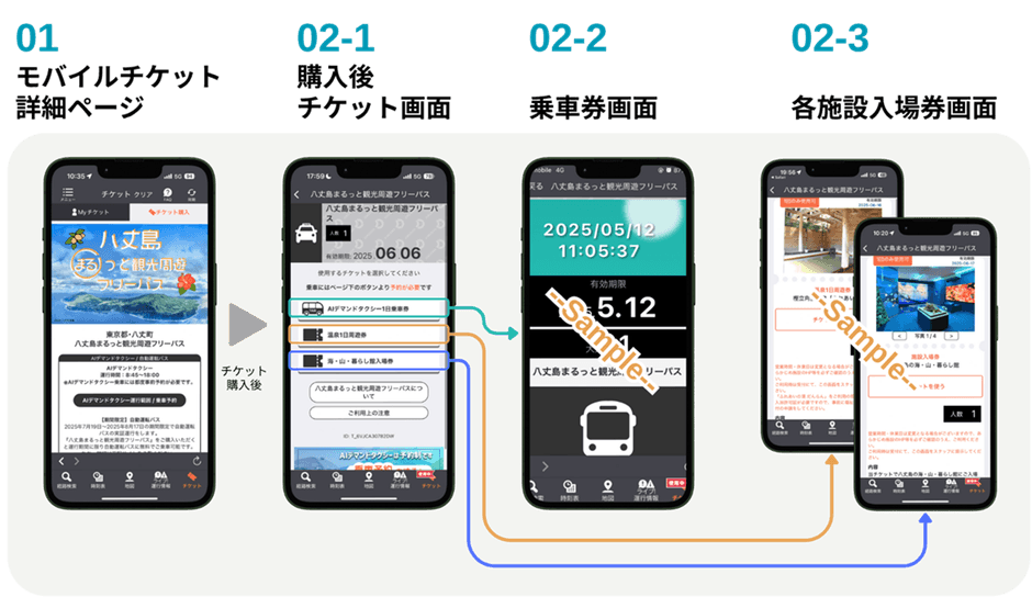 本チケット1枚で、八丈島を走るAIデマンドタクシーが1日乗り放題、かつ各観光施設の入場券を利用できます。各観光施設は、島内各所に点在する温泉施設3箇所、「八丈島の海・山・暮らし館」が対象です。AIデマンド交通や期間限定で実証運行の自動運転バスで島内を縦横に巡ることができ、効率よく島内移動を体験できる設計です。