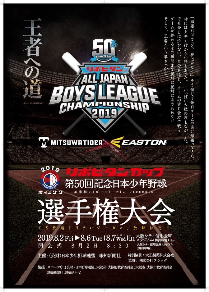 公益財団法人 日本少年野球連盟(所在地:大阪市浪速区、会長:藤田 英輝)は、2019年8月2日(金)~6日(火)に「リポビタンカップ 第50回記念日本少年野球選手権大会美津和タイガー×イーストンpresents」を下記の要領で開催いたします。