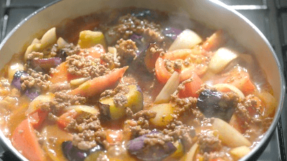 ■なすとひき肉のさっぱりトマト煮<味ぽん:トマトジュース=1:1>