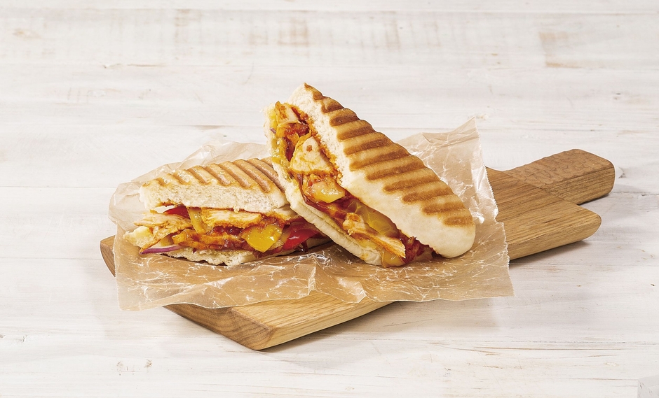 カレー風味のソースを塗ったパニーニパンに、大ぶりのタンドリーチキンとグリルした2色のパプリカをボリュームたっぷりに挟み込みました。こんがり焼き目のついたパニーニパンのサクッとした食感と、中の具材とのコントラストを熱々のままお楽しみいただける、セガフレードの商品開発チーム一押しの一品です。