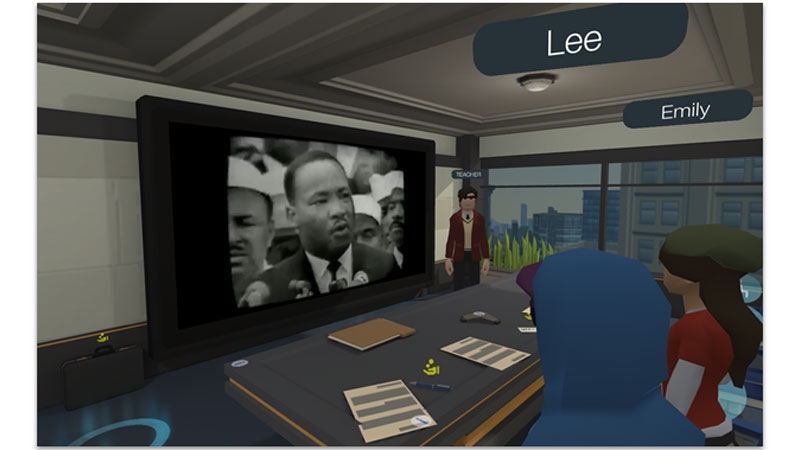 VRヘッドセットを使用し、バーチャル空間の中で、自分のアバターを直感的に操作しながら、あたかも自分がその中にいるかのような一人称目線で学習するプラットフォームです。音声会話や歩行、顔の向き等の操作をはじめ、付属のコントロールを使うことにより物をつかむ、投げる、物を調べるなど、リアルなアバター操作が可能です。
