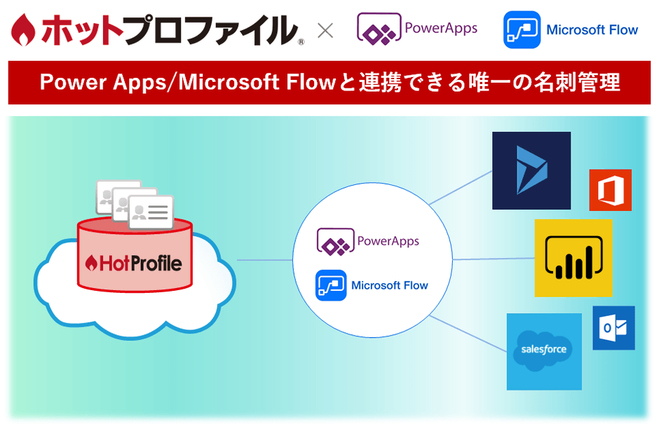 「ホットプロファイル」は名刺をスキャンするだけで、ほぼ100%の精度でデータ化できるクラウド名刺管理サービスです。この「ホットプロファイル」に登録された名寄せ済み名刺情報、会社情報を活用して「Power Apps」でアプリケーションを作成したり、「Microsoft Flow」で他社アプリケーションへノンプログラミングでデータを連携することができます。