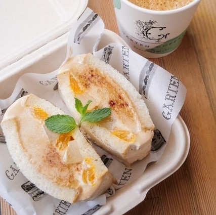 「GARTEN」のフルーツサンドは、季節の美味しい食材と豆乳ホイップクリーム※をたっぷり使い、全国からお客様が訪れ、行列ができるほど人気のメニューでした。フルーツサンドに欠かせない「豆乳ホイップクリーム※」は、「生クリームたっぷりだと重たくてカロリーも気になるけど、豆乳のホイップクリームだからペロリと食べられちゃう!」と大変好評で、優しい甘さとコク、まろやかでなめらかな食感でフルーツとの相性も抜群です。4月限定メニューの「桃とみかんの焦がしフルーツサンド」は、GARTEN COFFEE特製のエスプレッソソイクリームがたっぷり使われており、ジューシーな桃とみかんを詰め込み、表面がパリッとブリュレ状に焼かれています。トロッとしたフルーツの甘さ、エスプレッソソイクリームのまろやかなコクとコーヒーの香り、ブリュレの香ばしさ、それぞれの良さが引き立つ、まさに“魅惑のフルーツサンド”です。