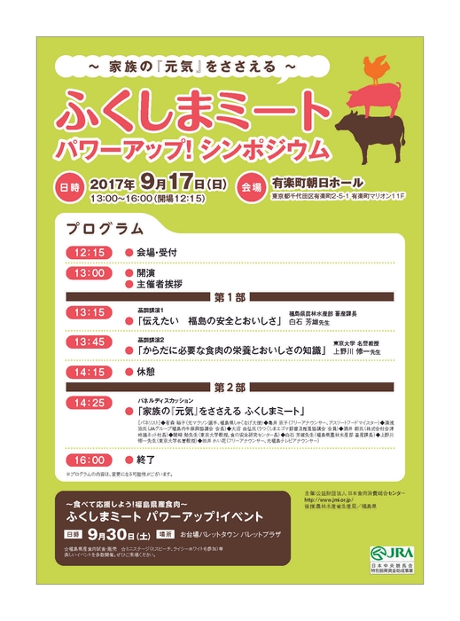公益財団法人日本食肉消費総合センター(所在地:東京都港区、理事長:田家 邦明)は、2017年9月17日(日)に福島県産食肉の需要拡大を目的とし、“家族の『元気』をささえる ふくしまミート”をテーマとした「ふくしまミート パワーアップ!シンポジウム」を有楽町朝日ホールにて開催します。