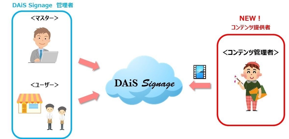この度、「DAiS Signage」のユーザー管理機能の権限ロールの1つに「コンテンツ管理者」権限を追加することで、コンテンツ提供企業が直接「DAiS Signage」にコンテンツをアップロードすることができるようになり、コンテンツ受け渡しの利便性を向上しました。